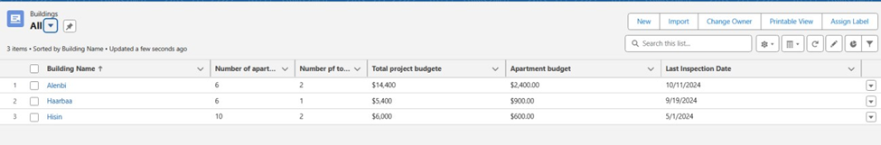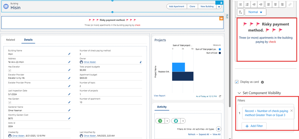 - Added a formula field Red Flag that displays “⚠ Building at Risk” if the count ≥ 3.