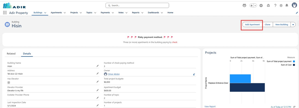 Add an alert on a Building record whenever three or more apartments in the same building use Check as a payment method. This ensures the management can identify risky payment patterns.