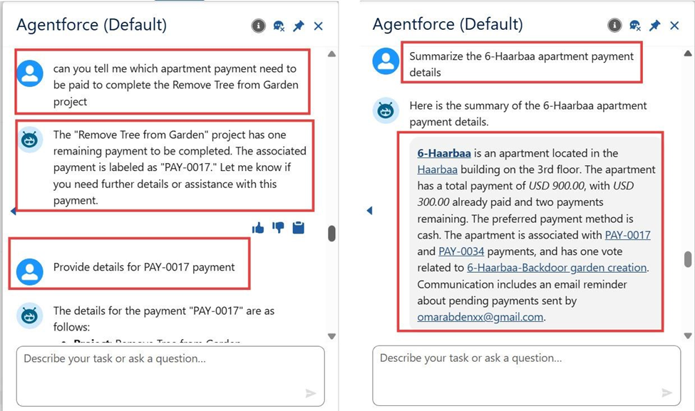 - Linked Agentforce to property management objects (Building, Apartment, Project, Payments, Votes).